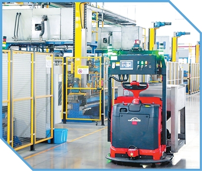 株硬集团粉末事业部的智能生产线上,自动导引车在进行无人化物料转运。